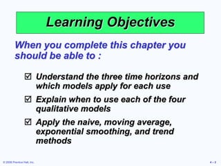 Quantitative methods of forecasting tend to be used very frequently in this time frame. 21 Describe the three forecasting time horizons and their use. Identify the three forecasting time horizons.